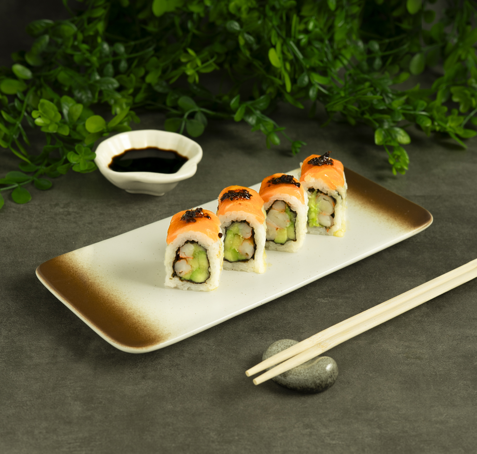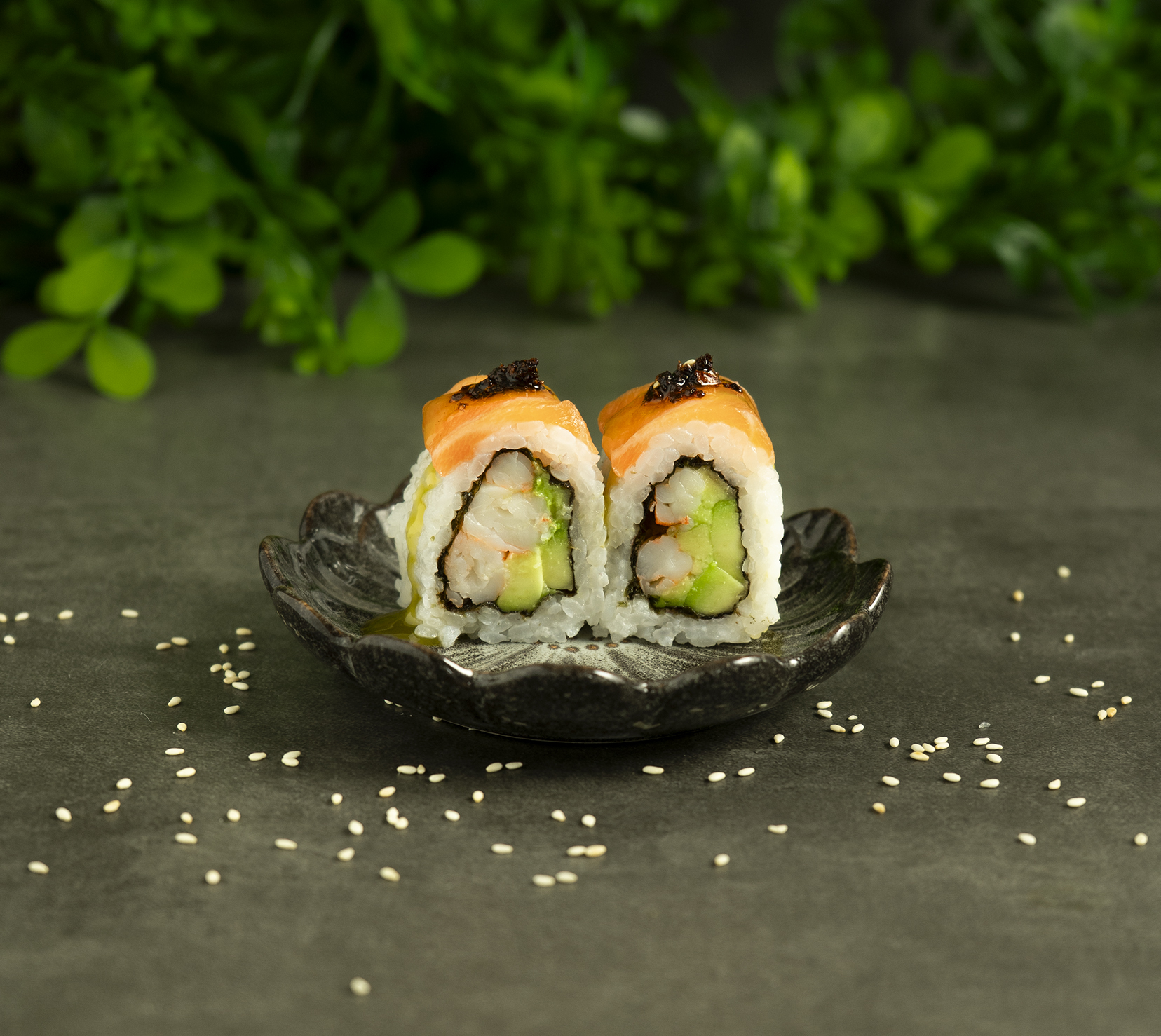 Langostino, palta. Cubierto con salmón y salsa de mango.