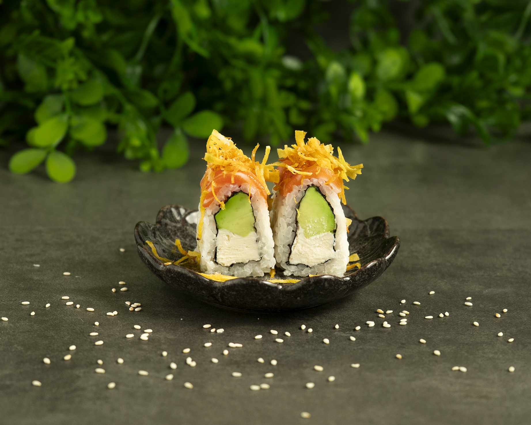 Queso philadelphia y palta. Cubierto con salmón, hilos de batata y salsa de maracuya.
