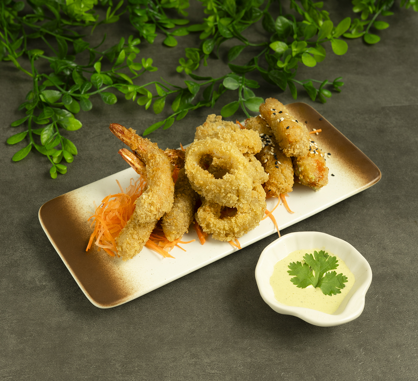 Mix Mar y Tierra en tempura: rabas, langostinos, pesca del día y pollo.