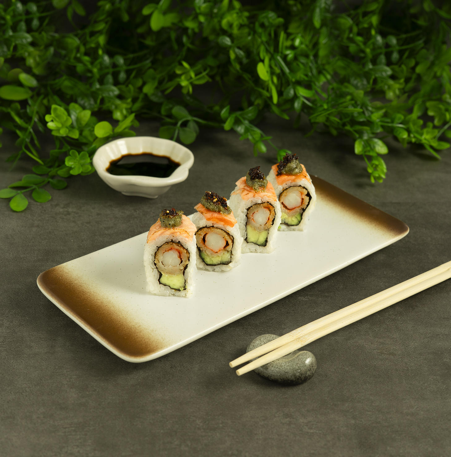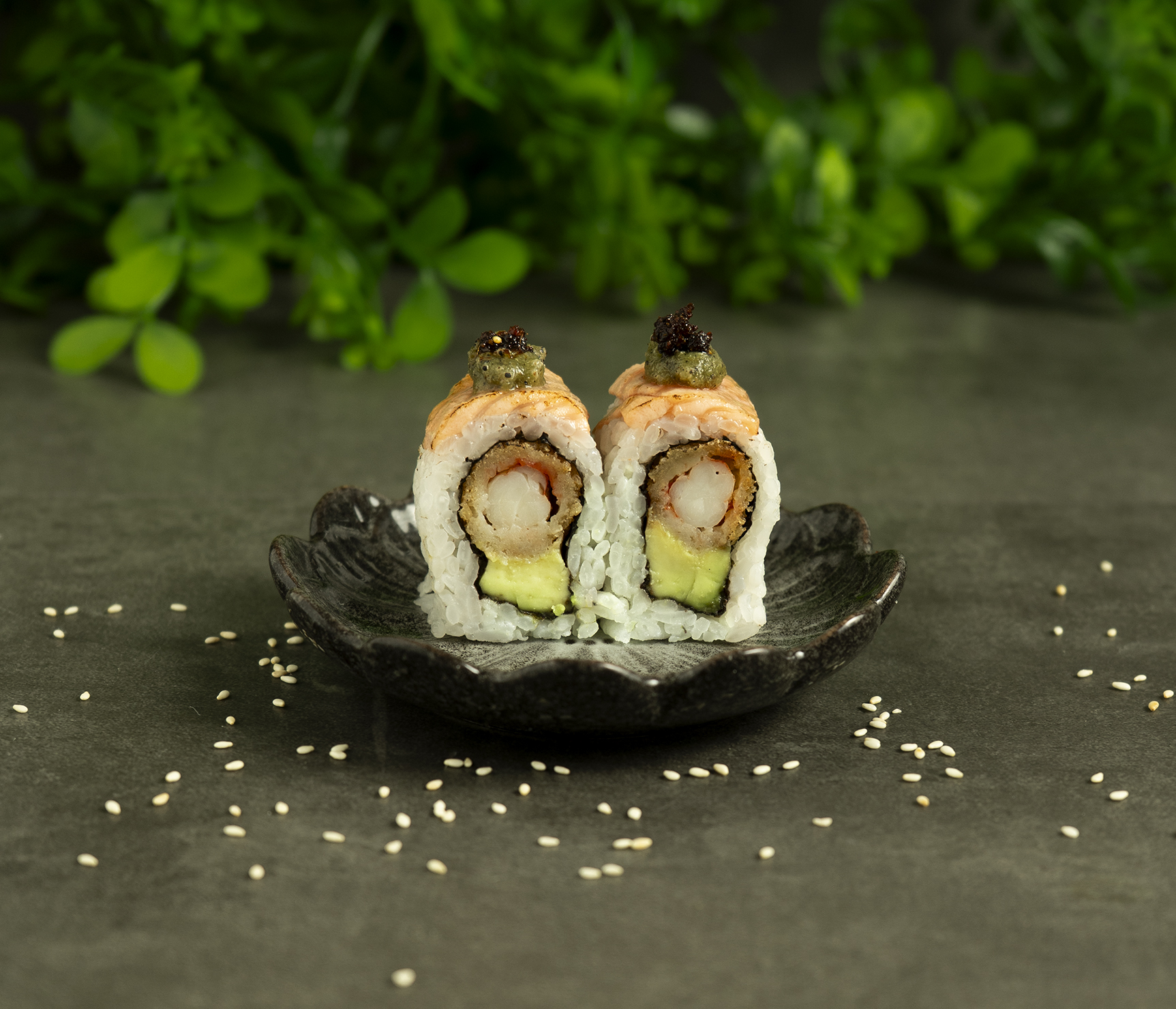 Langostino furai, palta. Cubierto con salmón flambeado con salsa parrillera.