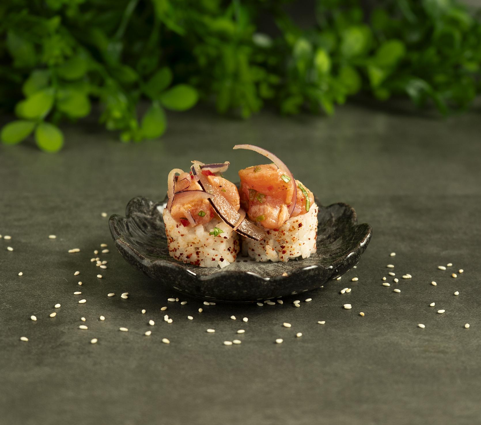 Batata glaseado. Cubierto con cebolla y topping de ceviche.
