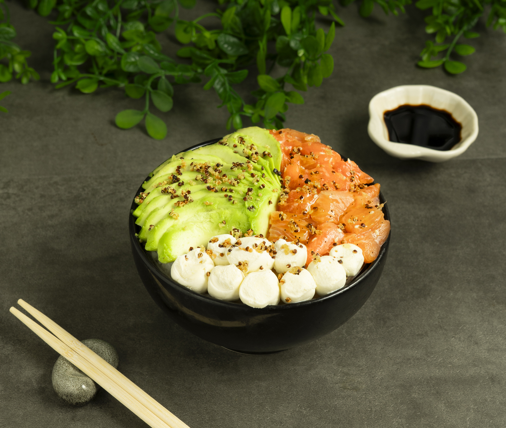 Base de arroz de sushi, salmón en salsa de maracuyá, queso crema, palta y quinoa crocante.
