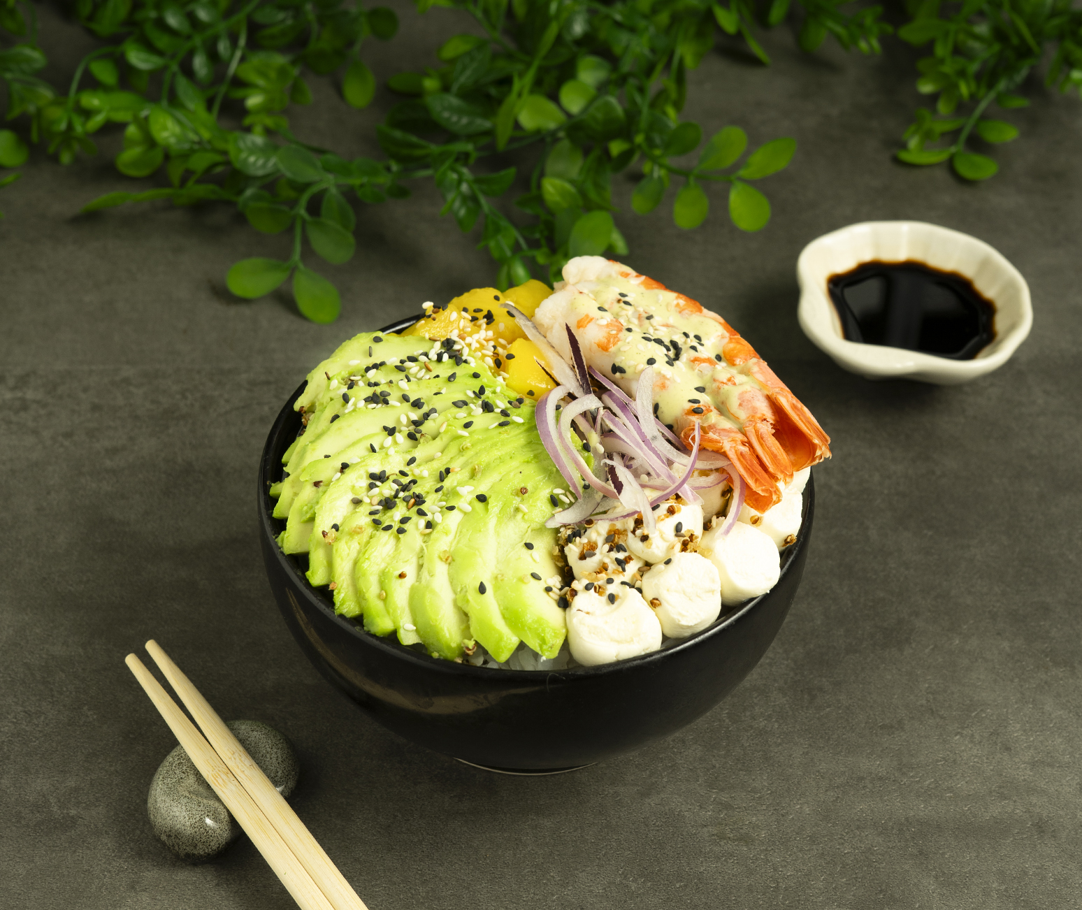 Base de arroz de sushi, langostinos, mango, cebolla, mango, palta y queso crema con salsa de la casa y sésamo.