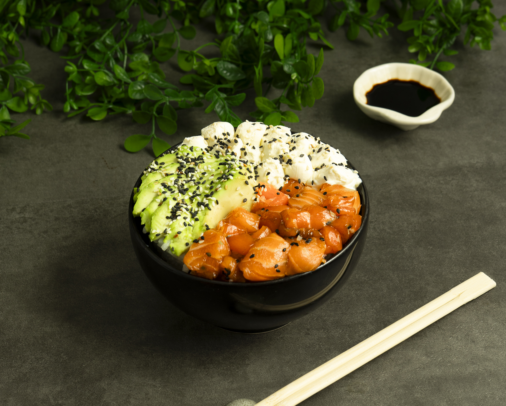 Base de arroz de sushi, cubos de salmón fresco, palta, queso crema y lluvia de sésamo.