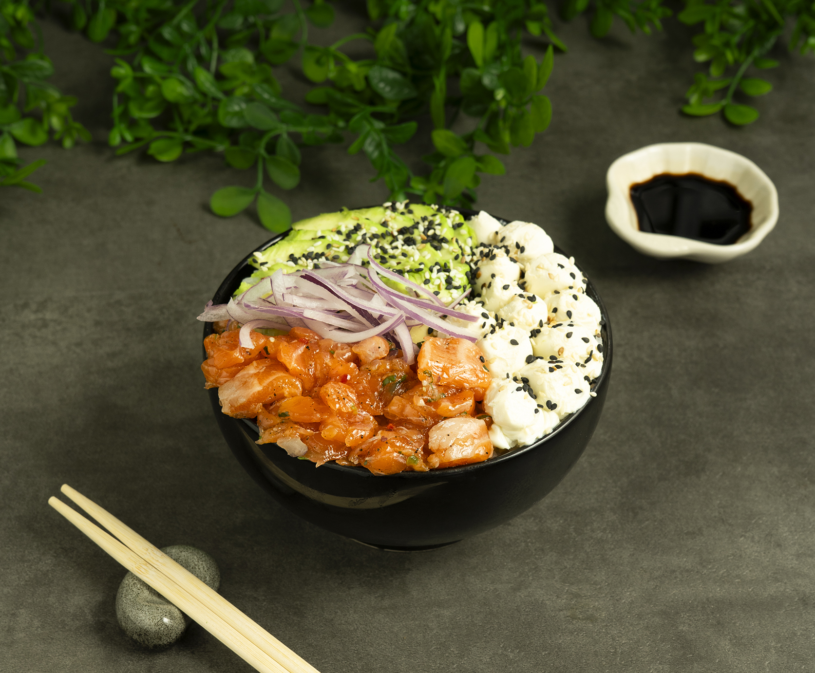 Base de arroz de sushi, tartar de salmon, cebolla morada, palta y queso crema con lluvia de sésamo.