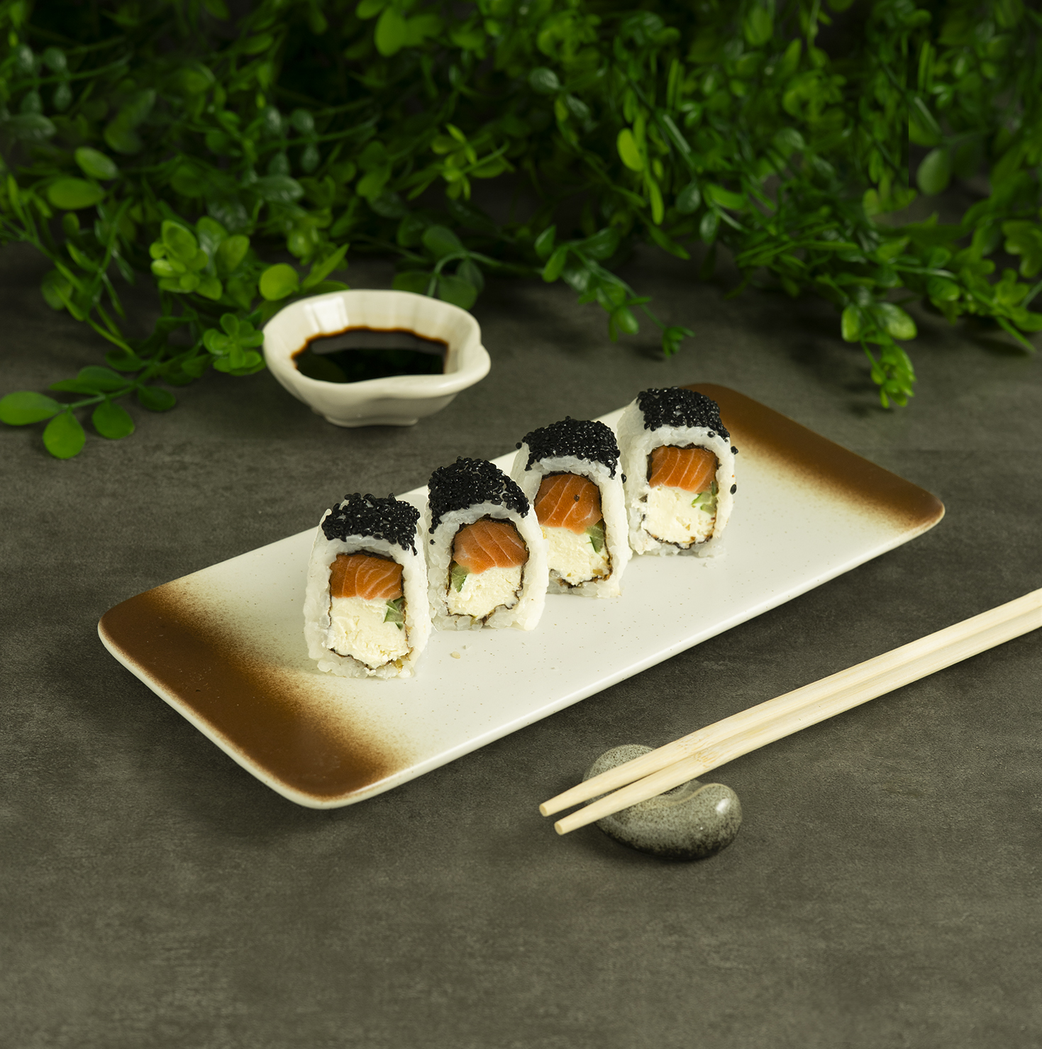 Salmón, pepino, queso philadelphia. Cubierto con caviar masago.