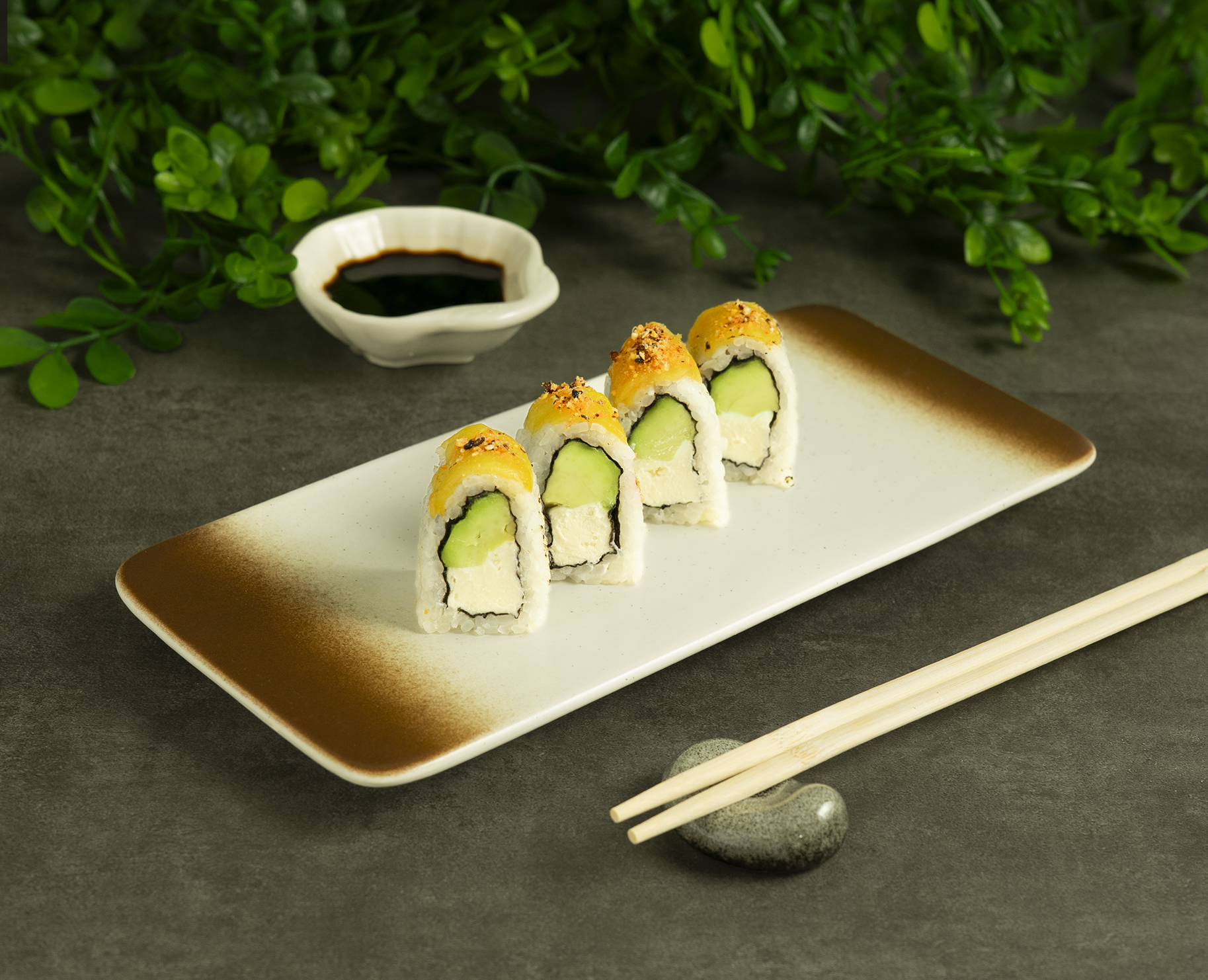 Queso philadelphia y palta. Cubierto con durazno flambeado y frutos secos.